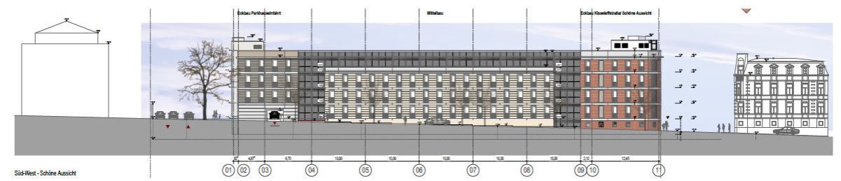 - Fassadenbild geprägt durch Nachempfindung von drei Einzelhäusern in Anlehnung an die in der Nachbarschaft vorhandene historische Villenstruktur (städtebauliche Vorgabe)
